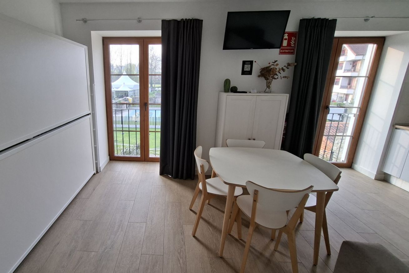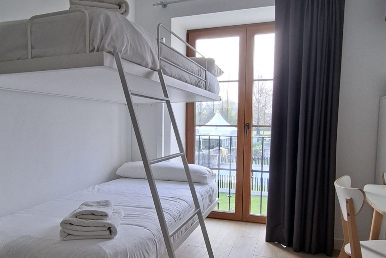 Este maravilloso apartamento de 40m2 está diseñado tanto para parejas como para familias, ya que cuenta con una habitación con una cama de 1,50m donde hay una bañera de hidromasaje doble y el salón dispone de una litera plegable con 2 camas de 90cm.